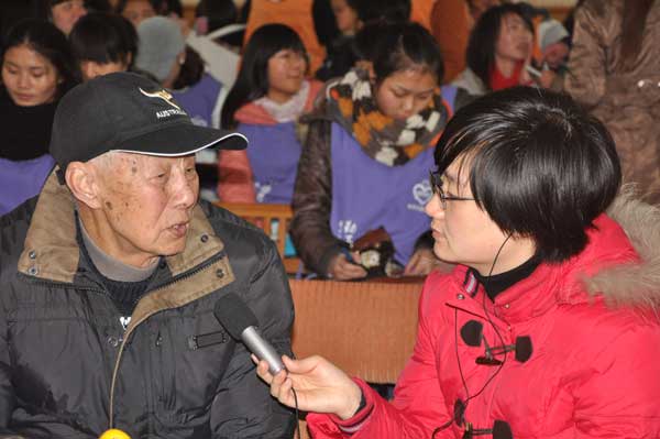 新聞記者現場采訪省黃埔軍校同學會副會長、抗戰黃埔老兵代表劉華(左)
