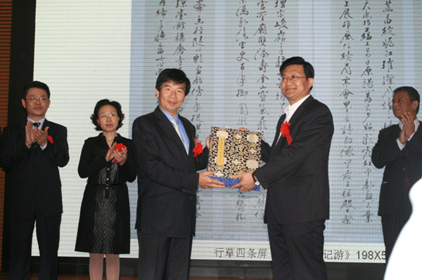 陳志聲先生(左)向河北省博物館贈送書法作品
