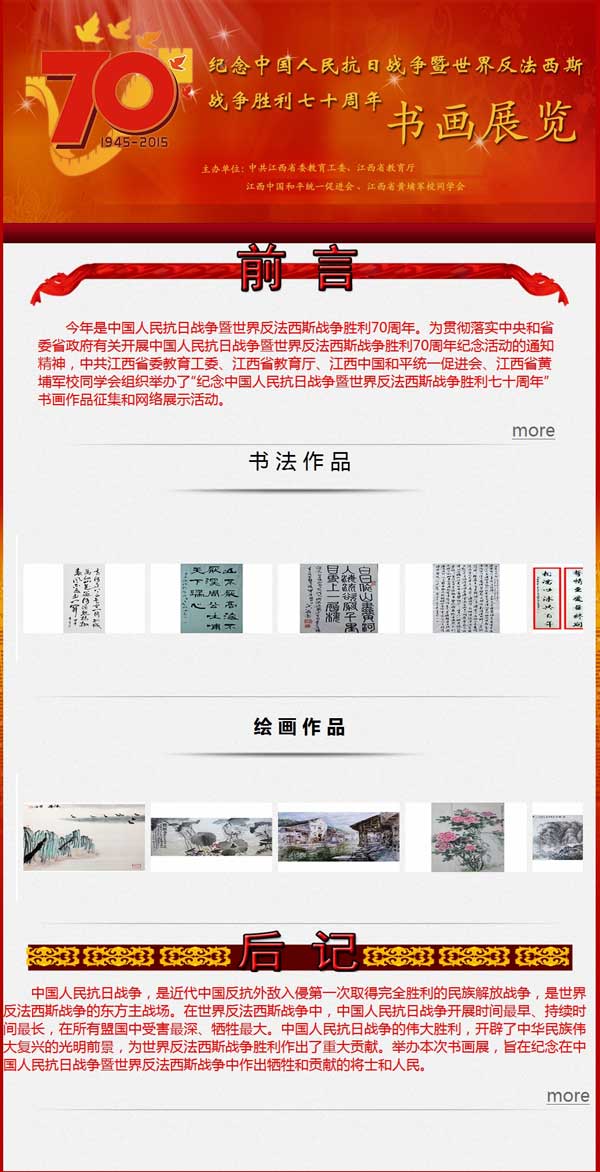 今年是中國人民抗日戰爭暨世界反法西斯戰爭勝利70周年,江西省黃埔軍校同學會與省直有關單位在全省各級學校聯合組織舉辦了以“銘記歷史、緬懷先烈、珍愛和平、開創未來”為主題的書畫作品征集和網絡展示活動。