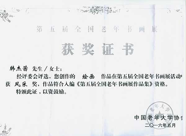 韓杰茜同學說,國家號召人人出彩、爭先創優,我響應號召作畫,不僅晚年生活豐富多彩有意義,客觀上為省市爭了光,也提升了自己。并表示將再接再厲,倍加努力學習書畫藝術,爭取創造出更好的書畫作品。