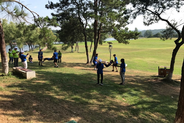 夏令營營員用自己搭建的擔架進行野外救援訓練