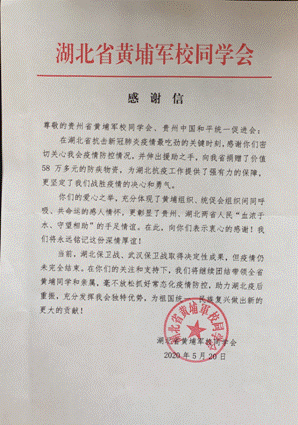 近日,貴州省黃埔軍校同學會先后收到貴州省紅十字會、湖北省黃埔軍校同學會發來的《感謝信》,對貴州省黃埔軍校同學會(貴州統促會)在新冠疫情爆發以來積極協調港澳海外資源捐款捐物、緊急協調采購醫用物資馳援湖北抗“疫’工作表示感謝。貴州省黃埔軍校同學會(貴州統促會)將發揮好“兩塊牌子、兩個平臺”的資源和優勢,積極攜手港澳臺海外力量,在做好反“獨”促統、助力經濟社會發展和決戰決勝脫貧攻堅事業中繼續發揮積極作用。