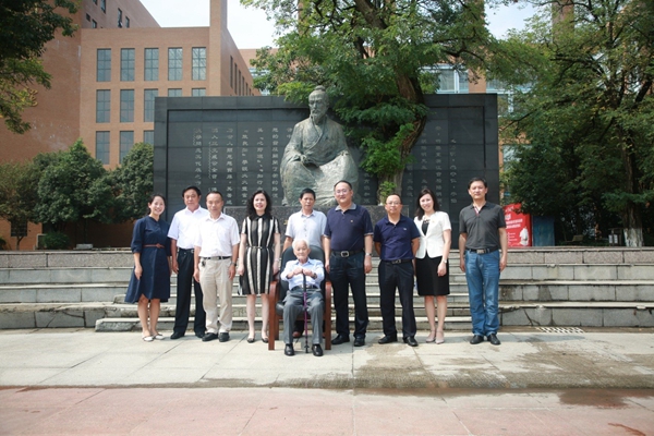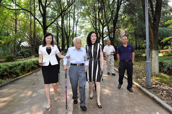 楊震環(前右)、楊方旭(前左)陪同夏禹聲老人參觀貴陽學院校園。