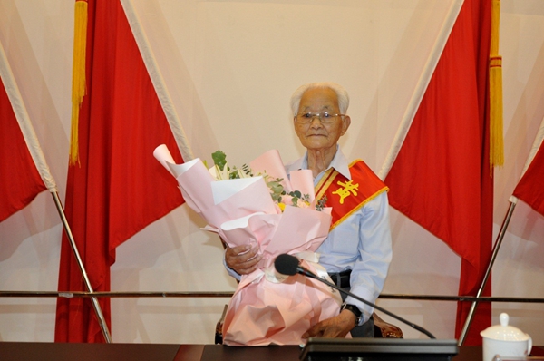 貴陽學院學生向夏禹聲老人敬獻鮮花。