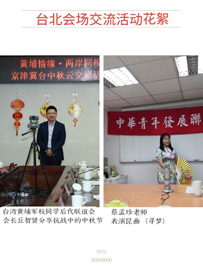 此次活動以視頻會議的形式舉行,北京、天津、河北、臺灣四地的藝術家、文化學者、非物質文化遺產傳承人及黃埔同學親屬中的文化藝術界人士和文化愛好者以同根同源的中華傳統文化為主題,在各自分會場通過網絡進行了線上分享交流,傳承弘揚優秀的中華傳統文化,傳遞同胞親情,共享節日歡樂。北京市黃埔軍校同學會秘書長陳清、天津市黃埔軍校同學會秘書長商駿、河北省黃埔軍校同學會秘書長劉禮梅、臺灣黃埔軍校同學后代聯誼會會長丘智賢、中華青年發展聯合會理事長王正出席交流活動并代表各自團體致辭。