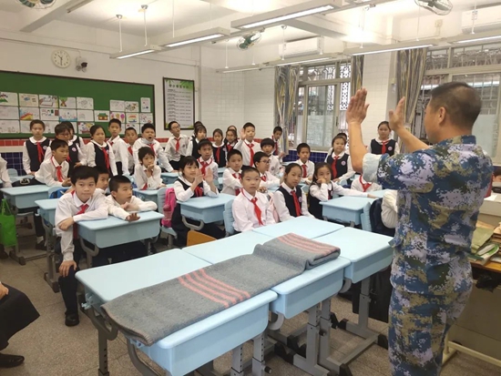 給學生展示疊“豆腐塊”軍被、打綁腿、背干糧袋等軍人日常技能