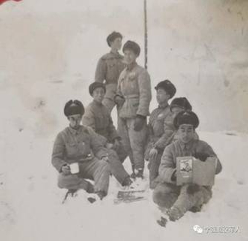 1952年10月,金城阻擊戰后在朝鮮東海岸休整,前排右1看畫報的是張仕鵬