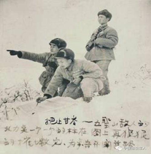 1952年12月,在五圣山偵查敵人火力點,左1為張仕鵬