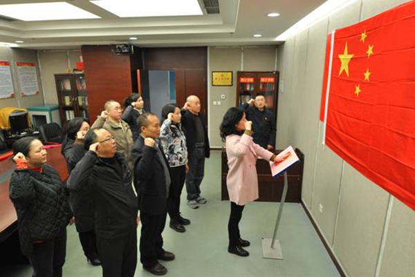 宣誓儀式上,全體機關干部整齊列隊、嚴肅認真,集體高唱國歌,跟隨秘書長楊震環的領誓,大家面向國旗作出自己的莊嚴承諾。