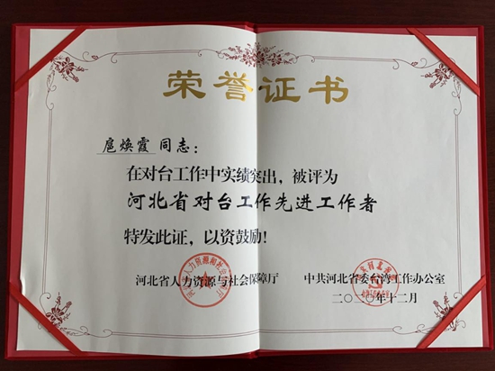 扈煥霞同志作為河北省黃埔軍校同學會業務骨干,多年來堅持以促進祖國統一為己任,發揚勤奮學習、恪盡職守、甘于奉獻的精神,自覺加強思想修養和黨性鍛煉,切實發揮黨員的先鋒模范作用,積極主動、扎實細致地做好對臺交流工作,出色完成了各項工作任務。扈煥霞同志表示,這一榮譽既是對個人的鼓勵和鞭策,也是對省黃埔軍校同學會工作的肯定和褒獎。今后將再接再厲、主動作為,不忘初心、牢記使命,為服務“祖國統一”和新時代建設“經濟強省、美麗河北”,開拓創新、擔當奉獻、再立新功。