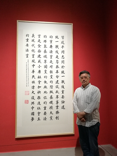 大家參觀后表示本次書畫展思想主題鮮明、文化底蘊濃厚,不僅充分展示出了重慶統一戰線廣大成員的風采,更是重慶統一戰線廣大成員緊密團結在以習近平同志為核心的黨中央周圍,攜手同心、砥礪奮進的真實寫照。重慶市黃埔軍校同學會推薦黃埔二代李大淮書法作品《習近平同志關于統一戰線重要論述》入選展出。