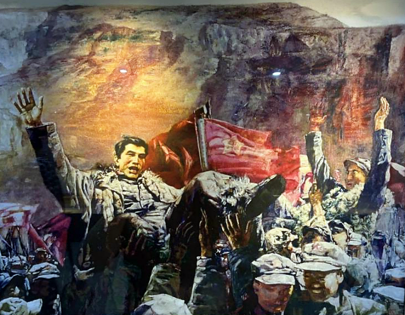 油畫表現的是1935年初在陜北永坪鎮,劉志丹率領紅二十六軍與紅二十五軍勝利會師的情景。