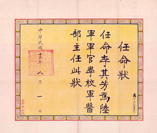 任命李其芳為陸軍軍官學校軍醫部主任此狀