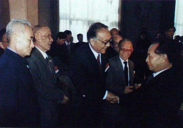 1986年11月,中共中央總書記胡耀邦同志(右一)接見黃埔同學會全體理事,與李贛駒理事親切握手