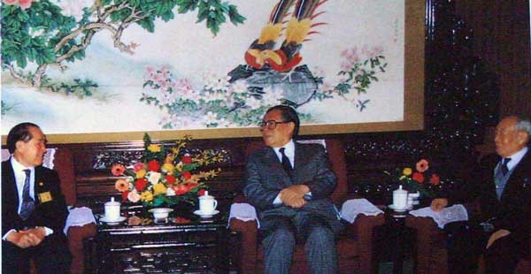 1991年4月10日江澤民總書記接見臺灣“中華黃埔四海同心會”名譽會長鄧文儀(左),侯鏡如會長(右)在座
