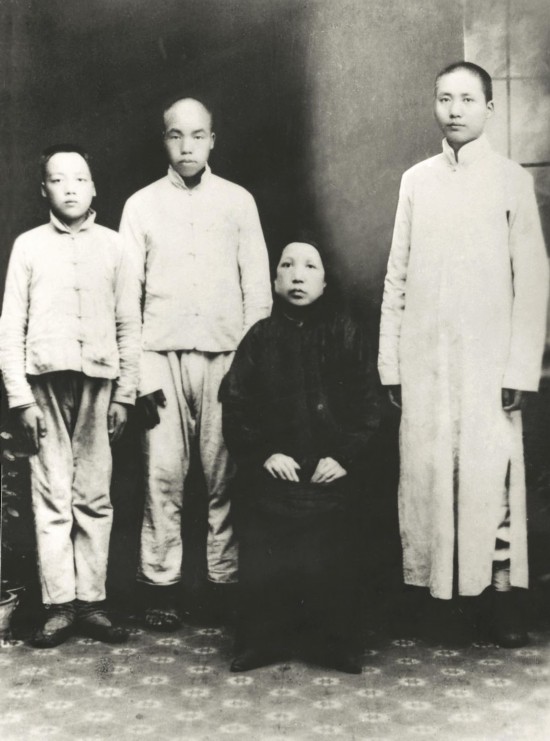 1919 年, 毛澤東( 右一) 三兄弟與母親文七妹在長沙合影。左二為毛澤民,左一為毛澤覃。