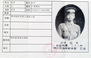 由于歷史原因和家庭多次搬遷,家庭原存有關外公李賢的史料遺失。20世紀80至90年代,欣揚曾陪同母親前往北京黃埔軍校同學會,查找李賢當年就讀黃埔軍校的相關史料。從黃埔軍校同學錄中,我們查到黃埔軍校第4期步科2團2連李賢,別名赤汗,年齡22歲,廣西玉林人,家庭通訊地址為:船埠海利鴻轉。