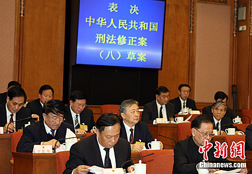 十一屆全國人大常委會第十九次會議25日下午經表決,通過了刑法修正案(八)。此次刑法修改的重點之一是取消了近年來較少適用或基本未適用的13個經濟性非暴力犯罪的死刑。中新社記者 任晨鳴 攝