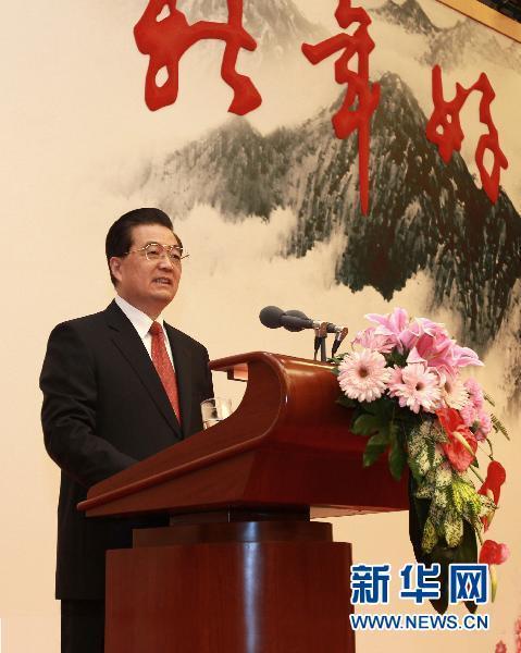 今天是2011年元旦。在這一元復始、萬象更新的喜慶時刻,我們在這里歡聚一堂,暢敘友情,共議國是,感到十分高興。首先,我代表中共中央、國務院和中央軍委,向各民主黨派、工商聯和無黨派人士,向各人民團體,向全國廣大工人、農民、知識分子、干部和各界人士,向人民解放軍指戰員、武警官兵和公安民警,向香港特別行政區同胞、澳門特別行政區同胞、臺灣同胞和海外僑胞,向關心和支持中國現代化建設的國際友人,致以節日的祝福!祝大家新年好!