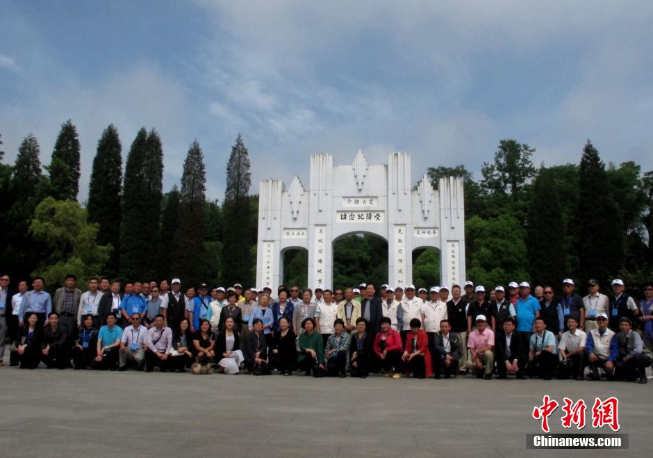 5月12日,參加第九屆黃埔論壇的兩岸黃埔組織代表、校友共赴抗戰勝利受降地湖南芷江參訪,追憶抗戰歷史。圖為黃埔論壇與會者在芷江受降紀念坊前合影留念。中新社發 楊喆 攝
