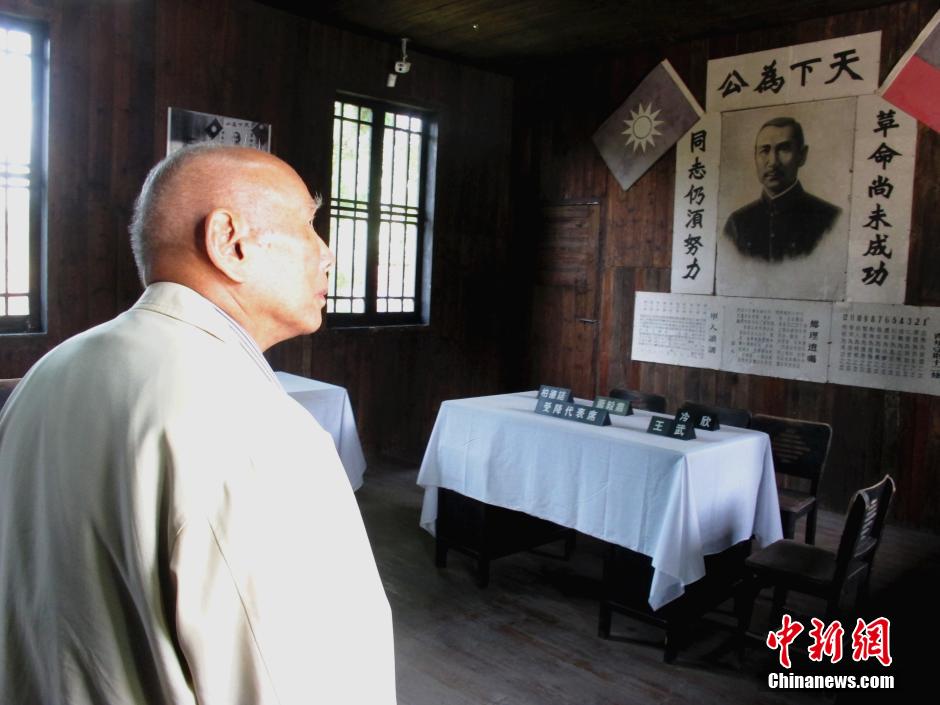 5月12日,參加第九屆黃埔論壇的兩岸黃埔組織代表、校友共赴抗戰勝利受降地湖南芷江參訪,追憶抗戰歷史。圖為黃埔軍校同學會會長林上元參觀芷江受降舊址。中新社發 楊喆 攝