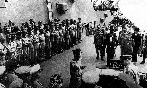 ?。乖拢踩赵绯?,東京灣陰云低垂。9時整,受降儀式在美軍第三艦隊旗艦“密蘇里”號上正式開始。