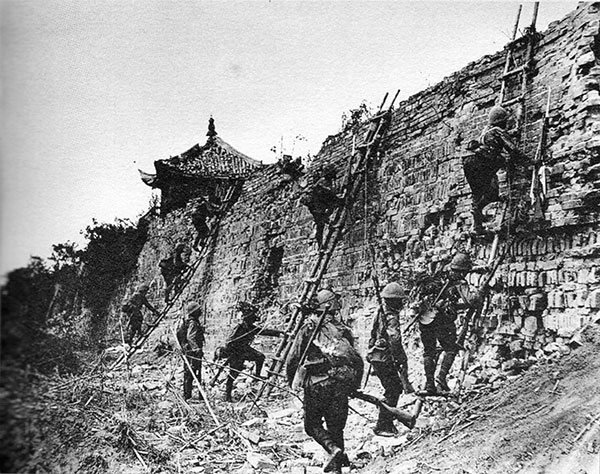 1937年9月5日,日軍調集重兵及30艘軍艦向寶山縣城發起猛攻,由于久攻不下,第二天向城內發射大量硫磺彈,造成全城房屋盡被燒毀.圖為圍攻的日軍正試圖登越城墻