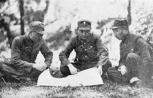 36師師長宋希濂(中,黃埔1期)及團長盛家興(右,黃埔5期)在淞滬前線研究作戰計劃
