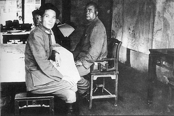 第三戰區司令長官馮玉祥(右)與第9集團軍總司令張治中(黃埔軍校原教育長)一起研究作戰方案