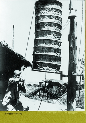 在位于三峽博物館一樓的展廳中,兩幅抗戰時期的珍貴圖片,向觀眾們再現了這種抗戰時期的特殊工具。張榮祥說,重慶當年的警報球為紅色圓球和綠色長筒球兩種,直徑不小于50厘米,球內安有燈具供夜間使用,以竹篾或藤籮為骨架,用絲麻等透光材料裱糊,安裝在人口稠密的制高點和交通要道。紅球用來表示敵機發動空襲,綠球表示解除警報。