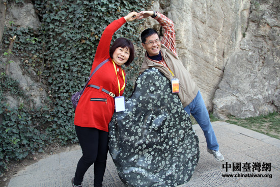 來自高雄的李維良將軍和夫人在牡丹石前留影。牡丹石:是一種不可再生的稀有資源。國際石材界公認其為世界奇石,被列為世界珍稀品種。它集山川之靈秀,匯詩情畫意之美韻,是美石中的奇葩。(中國臺灣網 李丹 攝)