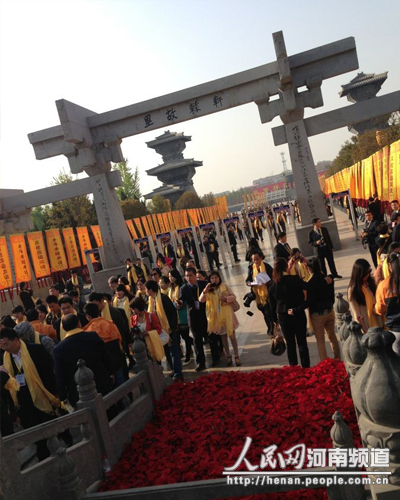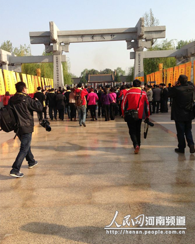 人民網新鄭4月12日快訊 上午8點左右,媒體車隊抵達新鄭市黃帝故里拜祖現場,會場內外簡樸莊重之風迎面撲來。8000參會人員秩序井然步入會場,大典流程方面也進一步簡化,省去了規模龐大的“迎親”儀式。大典內外場布置簡樸莊重,僅拜祖內場包括“拜祖臺”等地設有必要的地毯,沒有了“花?!钡狞c綴,整個會場更加莊重,嚴肅。記者從現場了解到,為使客人們在拜祖大典當日,在現場能夠充分體驗河南風光、新鄭特色、黃帝文化,今年拜祖廣場上新添置了兩個大屏幕。