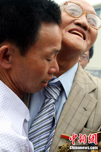 中新社南昌5月11日電 (劉占昆 周宇斌)5月11日,闊別家鄉72年之久的92歲中國遠征軍老兵劉輝踏上江西這片故土,面對著久違的家鄉親朋,禁不住熱淚盈眶。劉輝用顫抖的雙手與眾人一一打招呼,激動地說:“我從未想過能回到故鄉”。