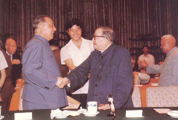 1985年6月11日,在黃埔軍校同學會第一次會員代表大會主席臺上,習仲勛(左)問候許德珩顧問