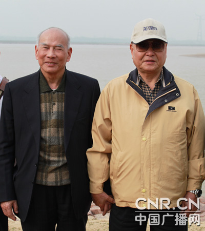 黃埔同學會會長林上元(左)與臺灣退役上將王文燮(右)在黃河岸邊攜手