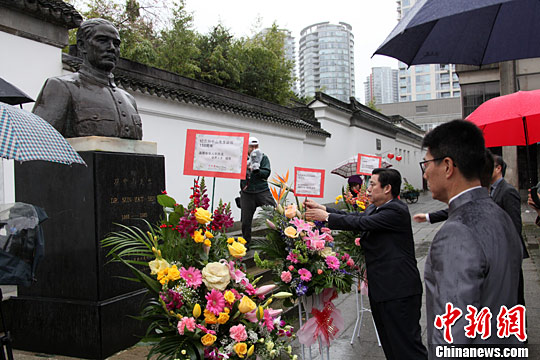 旅居溫哥華的華僑華人當地時間11月13日舉行活動,紀念孫中山誕辰150周年。在座談會開始前,部分與會代表在華埠中山公園向1993年開始矗立于公園入口處的孫中山銅像獻花并致祭。圖為致祭現場。 中新社記者 徐長安攝