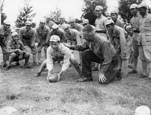 1944年10月15日,美軍士兵向中國兵講解橄欖球。