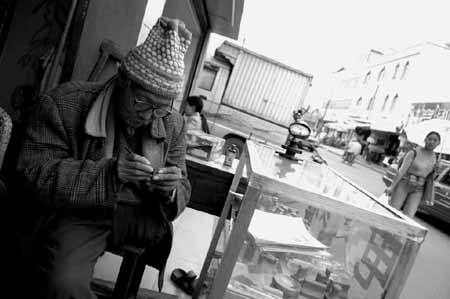 在騰沖街頭,左腿高位截肢的郭自益(82歲,云南騰沖人,原遠征軍11集團軍滇康緬游擊二區中尉)仍在街頭以篆刻謀生,每個章的價格為3元(電腦刻章8元)。