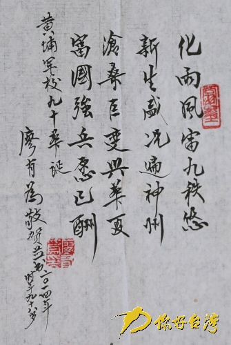 九十八歲黃埔老人廖有為賦詩祝賀黃埔軍校建校九十周年(你好臺灣網 圖)