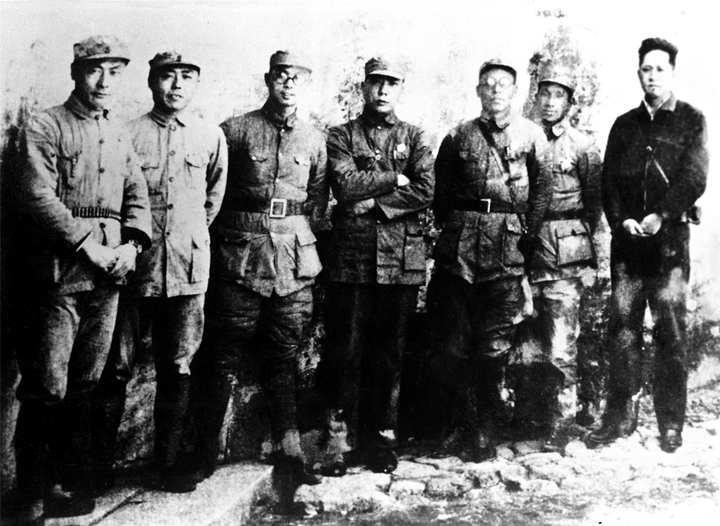 1937年10月12日,國民政府軍事委員會宣布,中國共產黨領導的南方8省14個地區(不含瓊崖)的紅軍游擊隊,改編為國民革命軍陸軍新編第四軍。圖為新四軍部分領導人在皖南的合影(左起:陳毅、項英、袁國平、李一氓、朱克靖、粟裕、葉挺)。