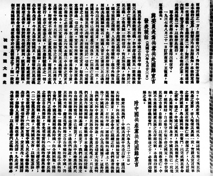 1937年7月,中國共產黨向蔣介石提交《中共中央為公布國共合作宣言》。9月22日,國民黨中央通訊社發表《中國共產黨為公布國共合作宣言》。次日,蔣介石發表談話,指出團結御侮的必要,實際上承認了中國共產黨的合法地位。國共合作宣言和蔣介石談話的發表,標志著抗日民族統一戰線正式形成。