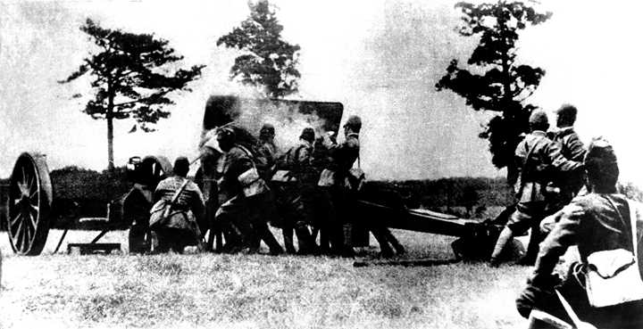 1937年7月7日夜,日軍在北平西南盧溝橋地區故意制造事端,向中國守軍發動進攻。圖為日軍炮轟宛平縣城。