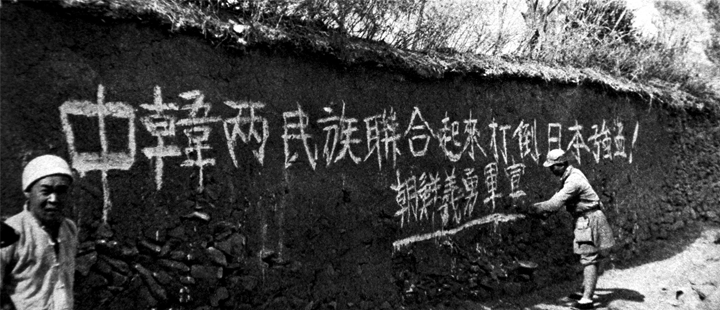 朝鮮義勇軍、義勇隊與中國人民一道抗擊日本侵略者。圖為朝鮮義勇軍在刷寫標語。