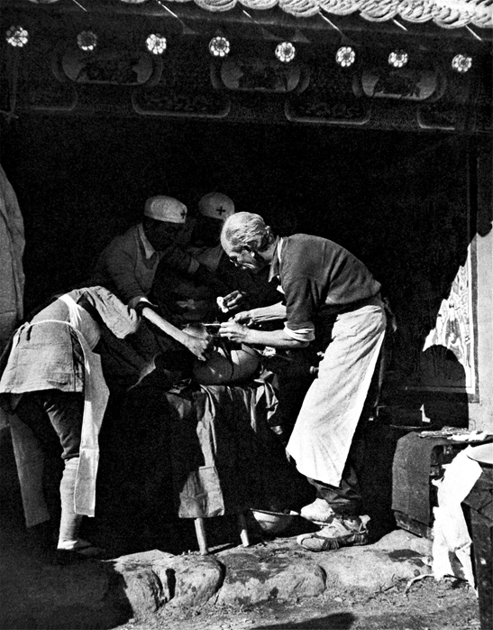 1938年3月,加拿大共產黨員、外科醫生白求恩率醫療隊到達延安,不久赴晉察冀邊區工作。1939年11月,白求恩在為傷員進行急救手術時受感染,11月12日,在河北唐縣病逝。圖為白求恩在前線為八路軍傷員做手術。