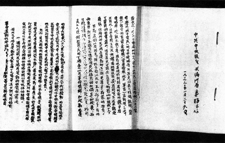 1933年1月26日,中共中央向中共滿洲省委發出指示,提出在東北組織全民族抗日統一戰線策略。圖為一·二六指示信。
