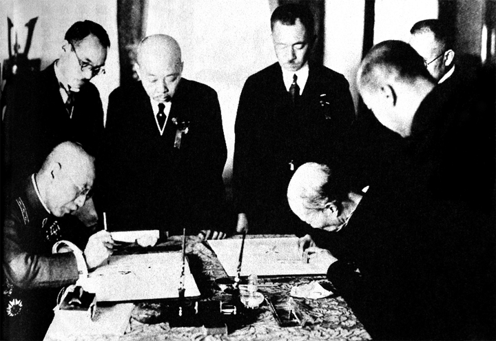 1932年3月1日,日本炮制的偽滿洲國宣布成立。9日,清朝廢帝溥儀出任偽滿洲國“執政”。同年9月15日,關東軍司令官武藤信義(左)與偽滿洲國國務總理鄭孝胥(右)簽訂《日滿議定書》。中國東北淪為日本的殖民地。圖為簽字現場。