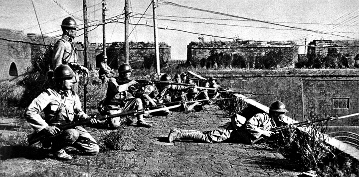 1931年9月18日夜,日本關東軍自行炸毀沈陽北郊柳條湖附近的一段路軌,反誣中國軍隊所為,以此為借口,進攻東北軍駐地北大營,炮轟沈陽城,制造九一八事變。圖為日軍在沈陽外攘門上向中國軍隊進攻。
