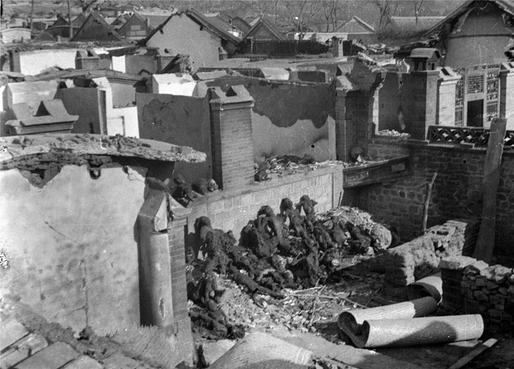 1941年1月25日,日軍在河北豐潤縣潘家峪屠殺村民1230余人。圖為被燒殺后的潘家峪。