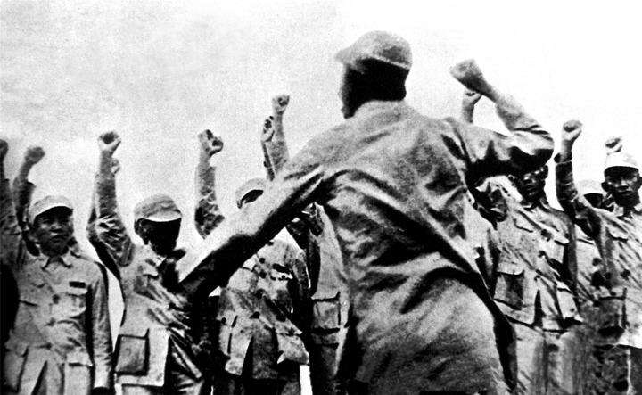 祖國的苦難牽動著海外赤子的心,成千上萬的華僑青年告別父母、妻回國服務。圖為東江華僑回鄉服務團吉隆坡成員在回國前宣誓:獲得勝利后,我們才肯再回吉隆坡。