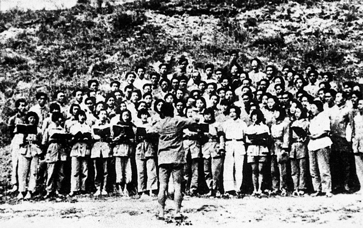 冼星海指揮延安魯迅藝術文學院合唱隊排練《黃河大合唱》。